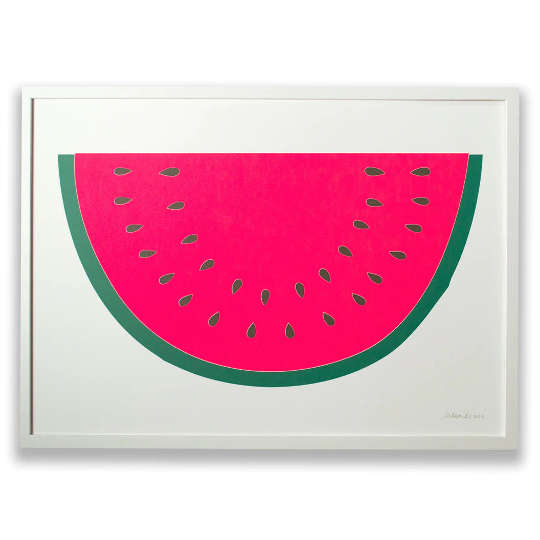 Better find your sunglasses! Our Watermelon Screen Print glows electric with our favourite neon pink with Green and soft black seeds. This 3-colour screen print will be sure to brighten any dark corner in your home.