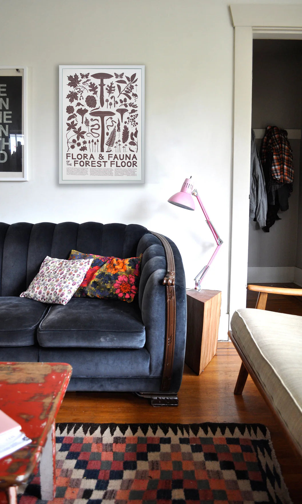 Thrilled to introduce our latest screen printed poster, the Flora & Fauna Forest Floor art print. Mushrooms, autumn leaves, acorns, pinecones, moths, snails, fern leaves and even an earth worm, all screen printed in a rich brown on white archival rag print making paper.