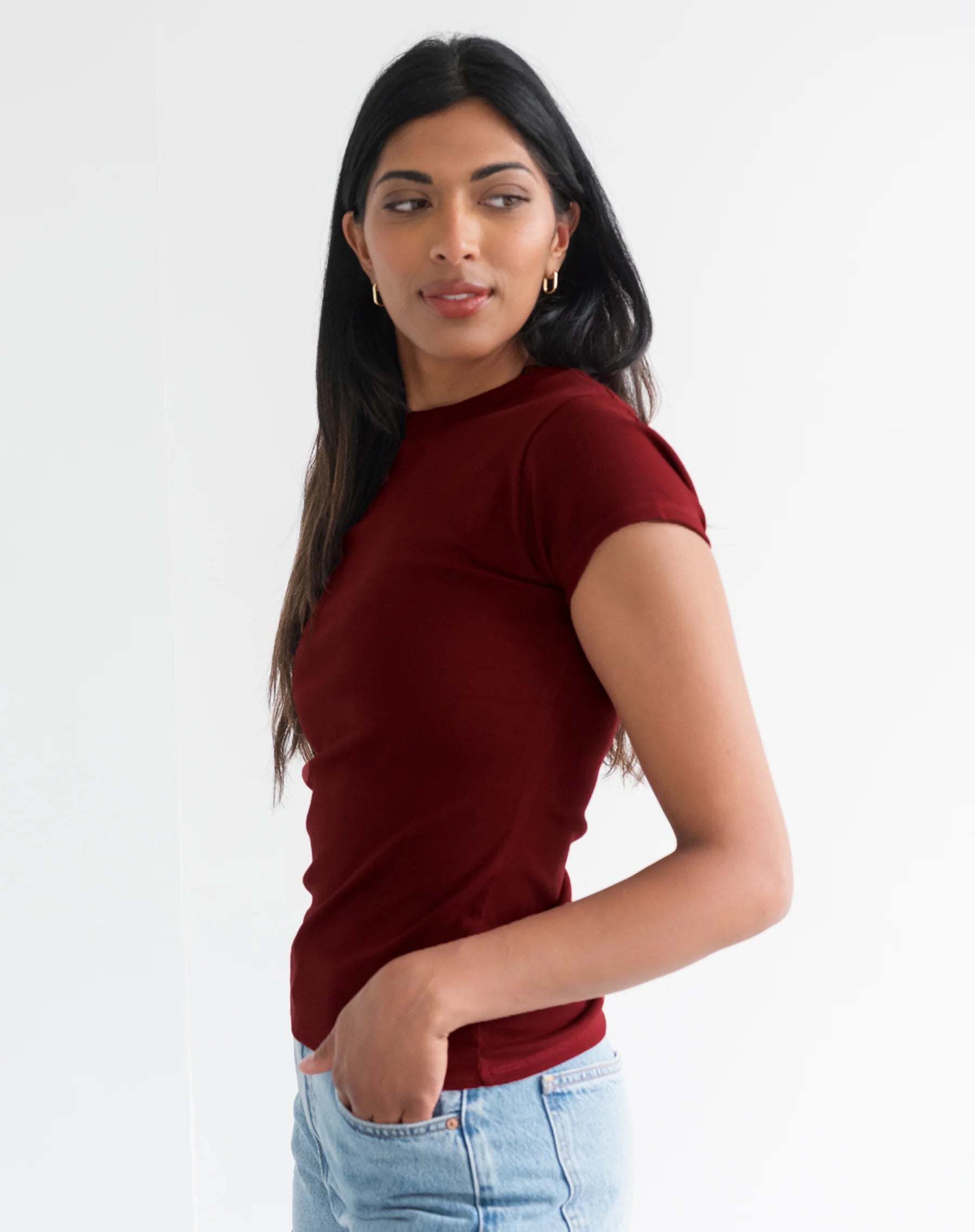 Our Ribbed Tee has a fitted body and hits below your hips.