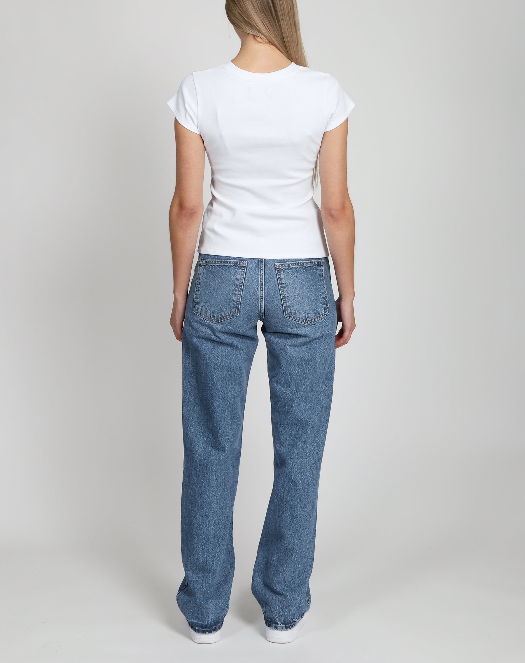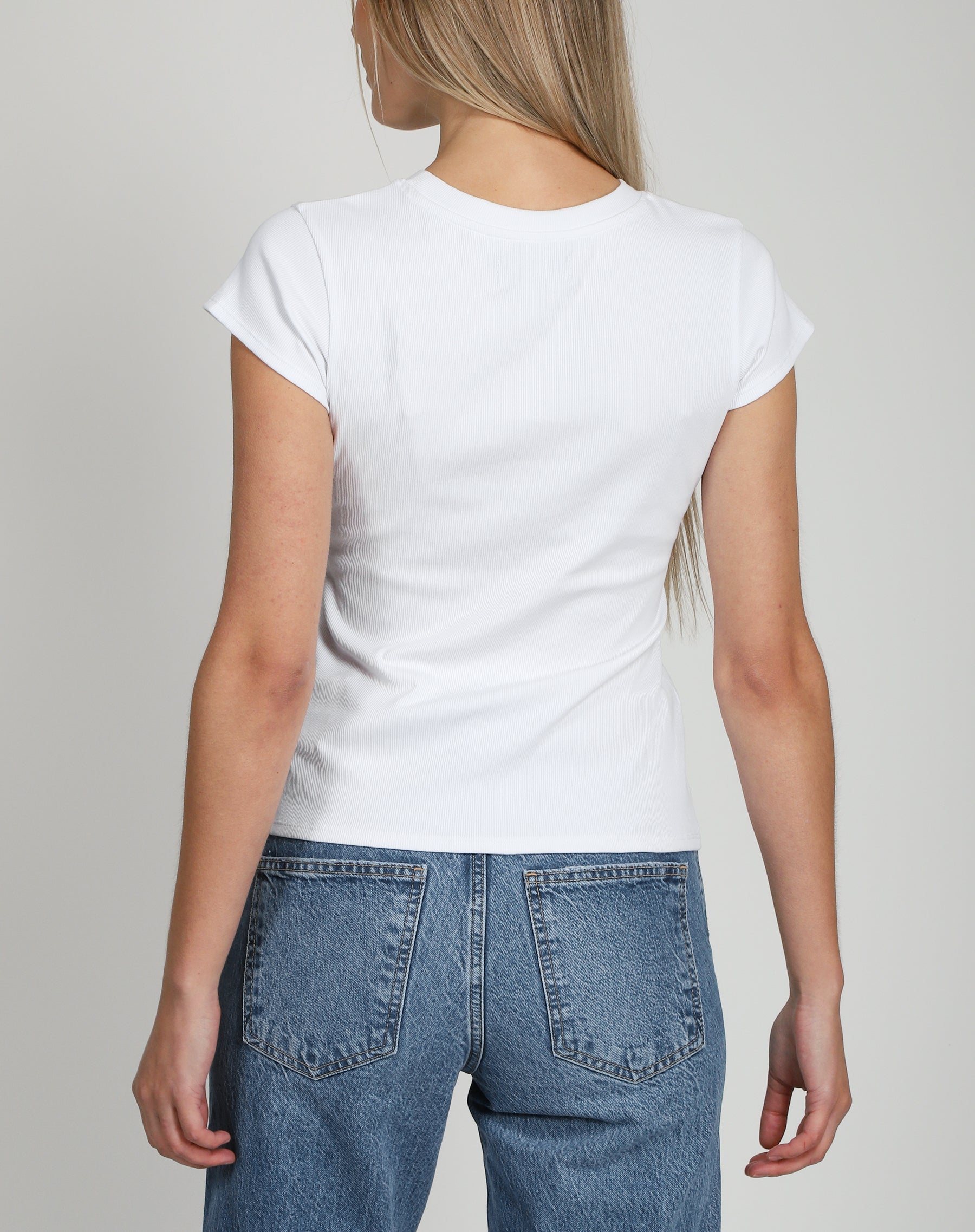 Our Ribbed Tee has a fitted body and hits below your hips.