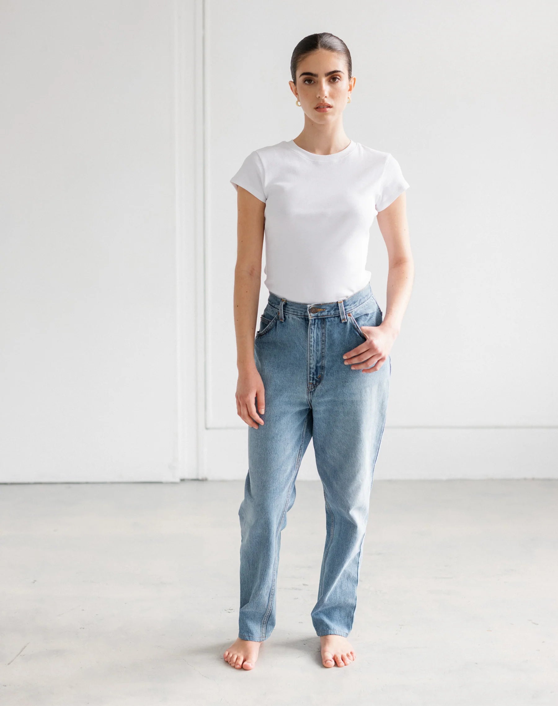 Our Ribbed Tee has a fitted body and hits just below your hips. She's made from a blend of cotton with a touch of spandex for that perfect amount of stretch. We recommend sticking true to size for this piece.