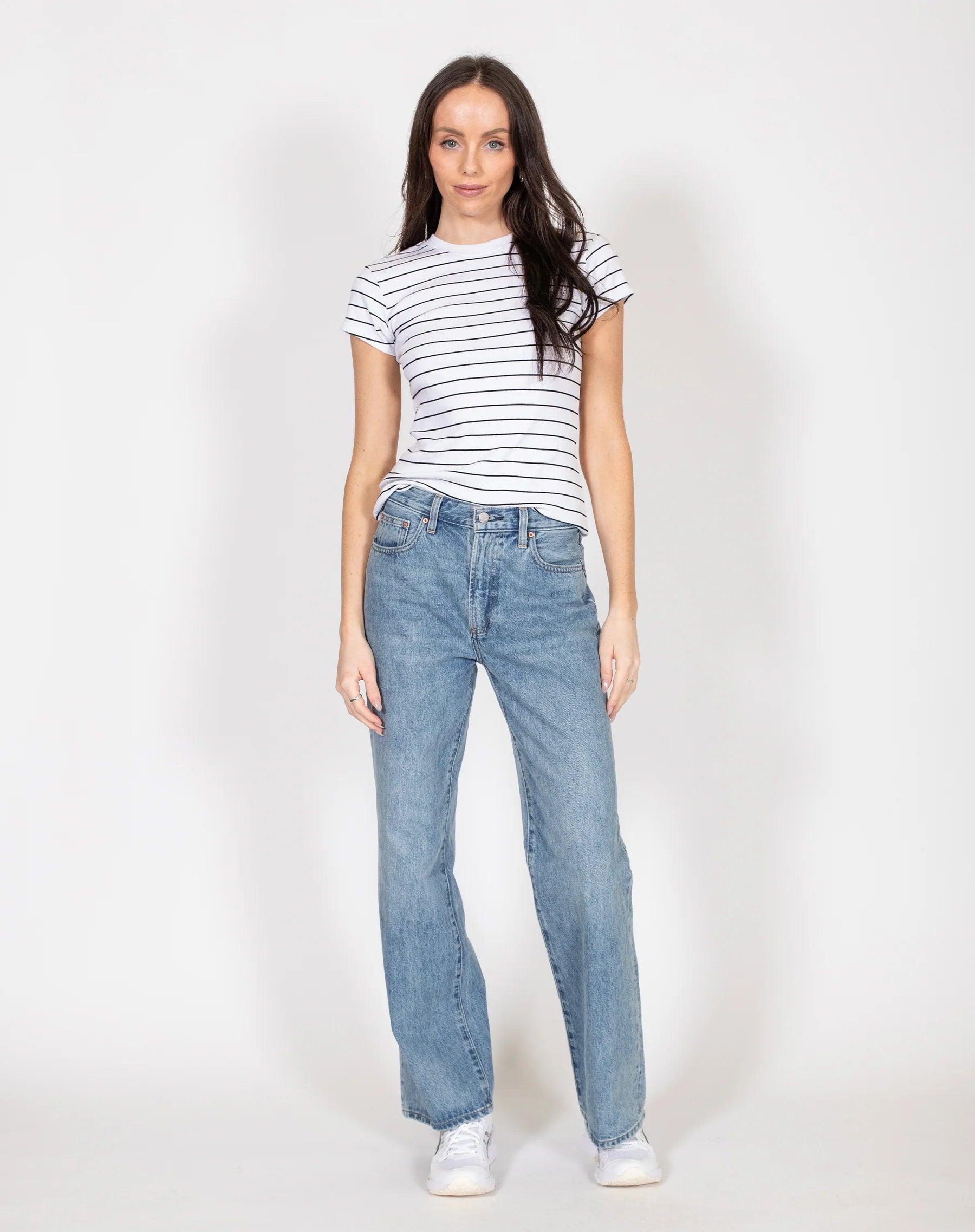 Our Ribbed Tee has a fitted body and hits just below your hips. She's made from a blend of cotton with a touch of spandex for that perfect amount of stretch. We recommend sticking true to size for this piece.