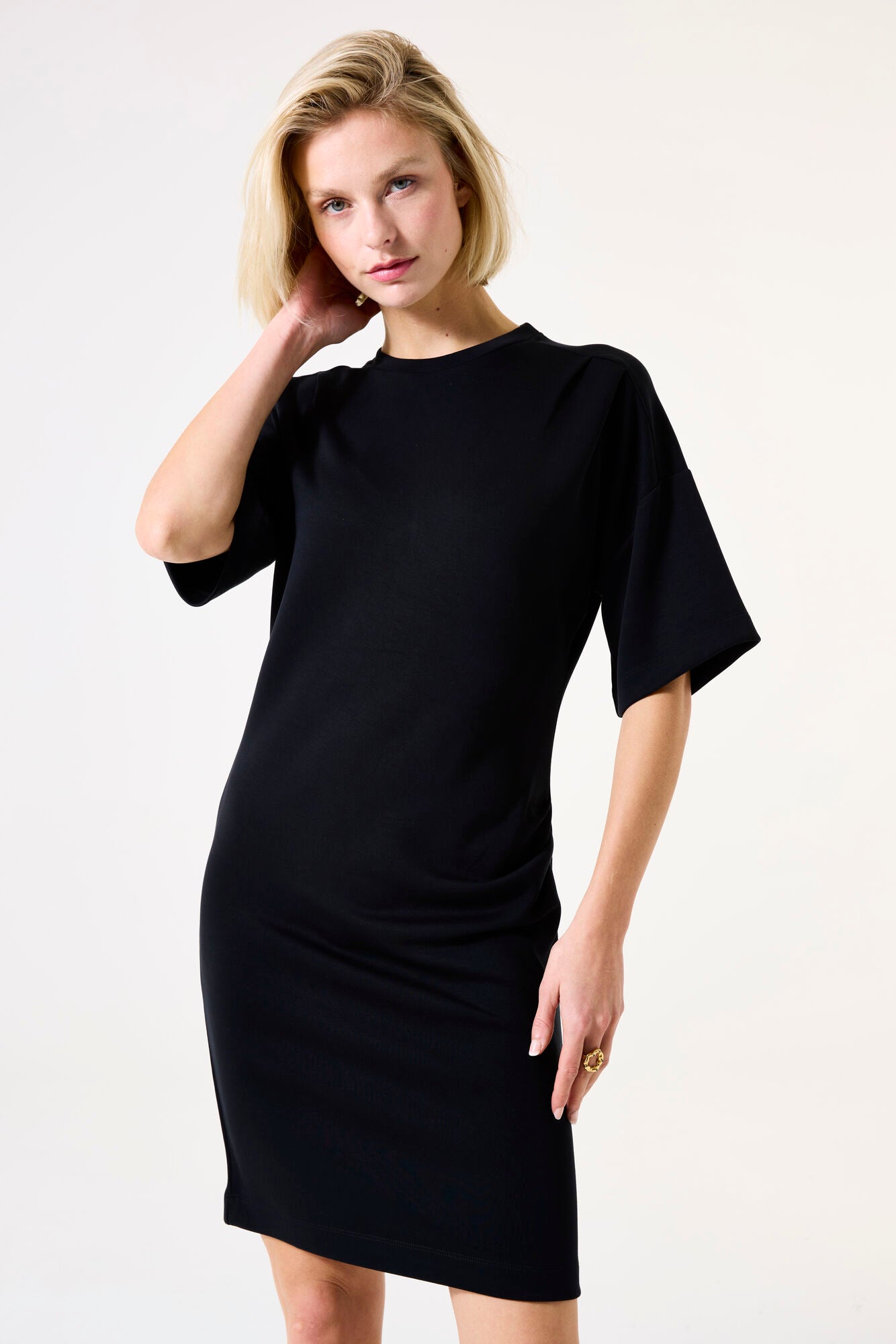 Black dress with a round neck, short sleeves, and a length that falls above the knee, featuring a relaxed fit. This item is made of 51% modal, 44% polyester, and 5% elastane, providing a comfortable and breathable fit.
