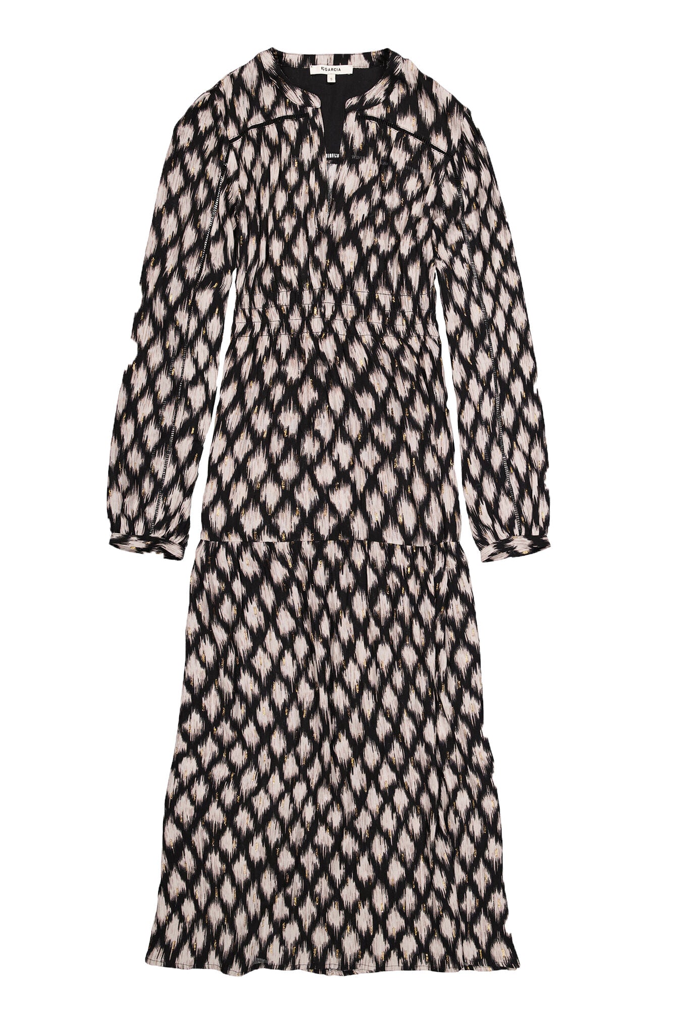 Elegant dress with a striking allover print. This dress features a V-neck, long sleeves, and a relaxed fit. Made of 97% viscose and 3% metallic yarn, it offers a luxurious look and a comfortable feel.