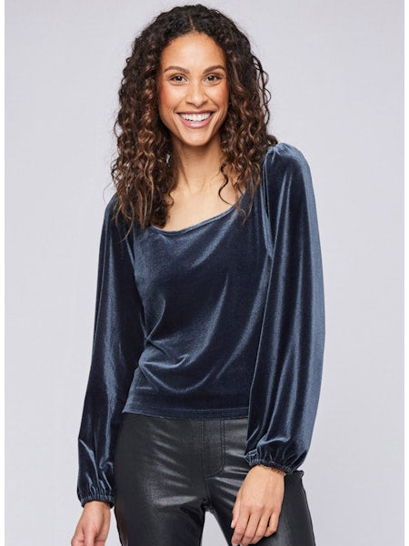 The Ariana top is made of a luxe velvet fabric that drapes beautifully. Features include a rounded square neckline and elasticated sleeve cuff.