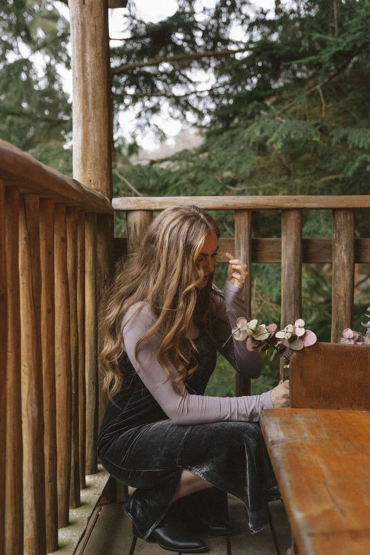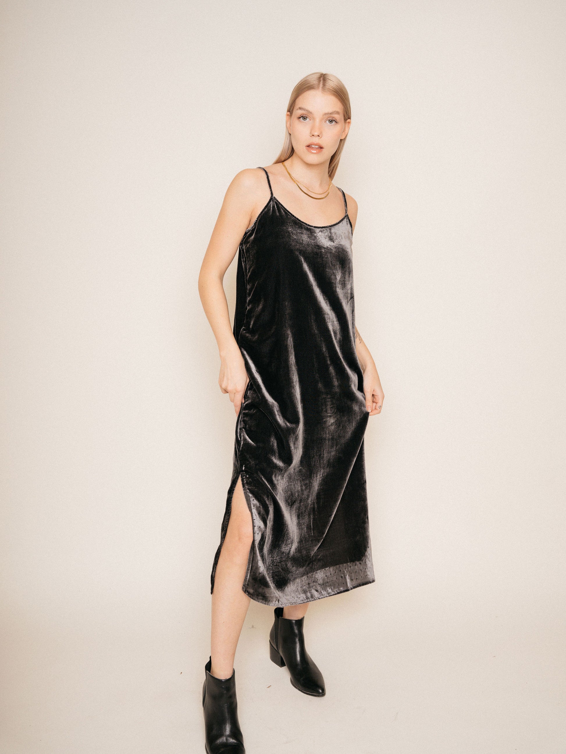 Make a statement at that holiday party and stand out in the Crisp Dress. Adjustable spaghetti straps, side slits, and beautiful luxe velvet. You don't need another excuse to not buy this piece.