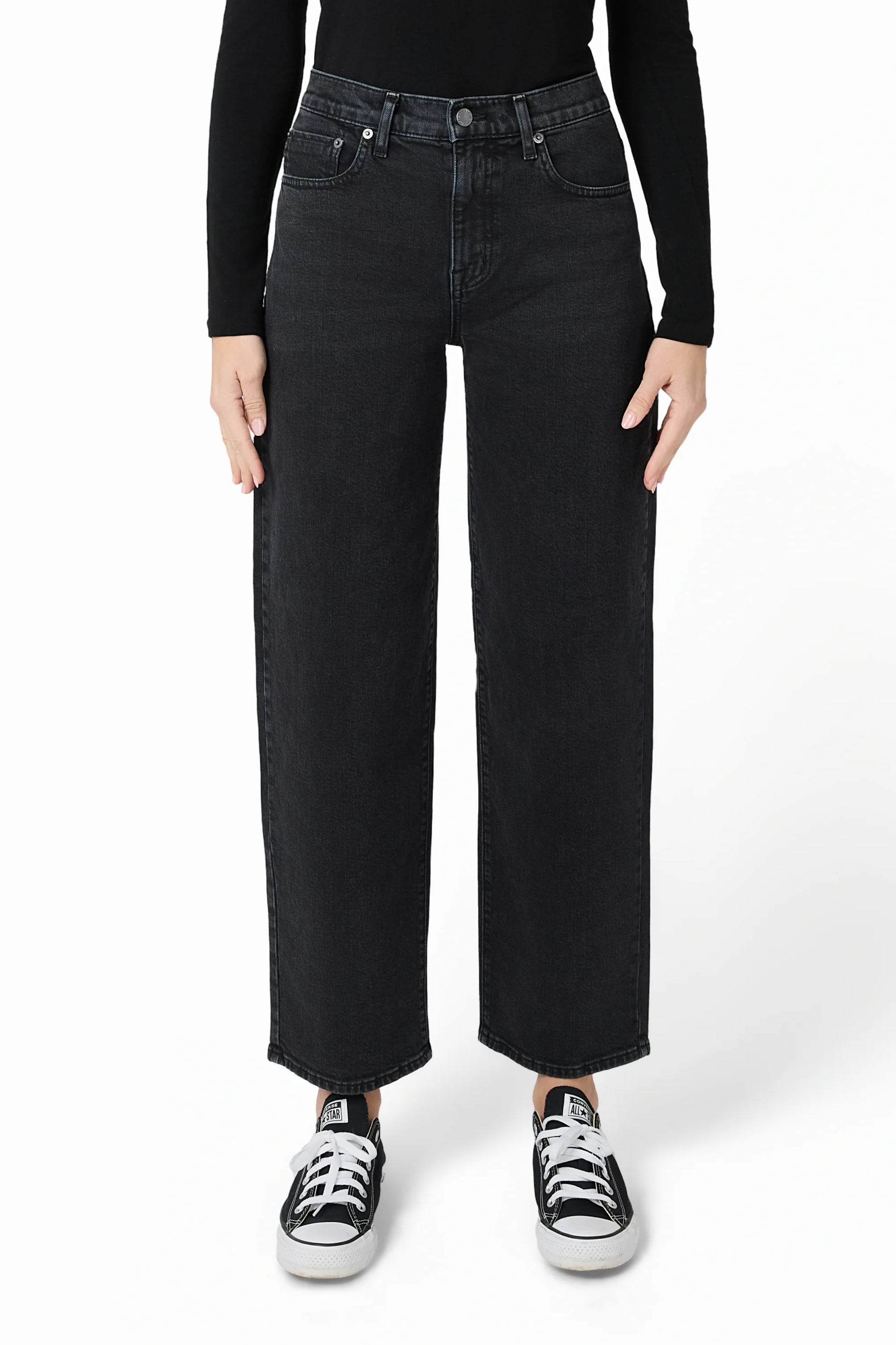 A high-rise barrel jean with a full leg that tapers to a cropped hem.