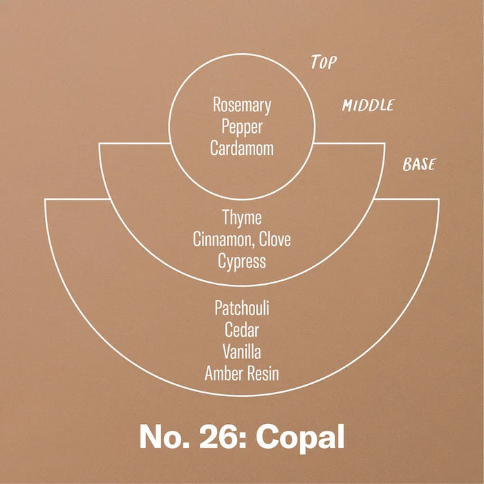 Farmer’s market herbs, dinners al fresco, incense burning in the distance. Rosemary, clove, and amber resin.