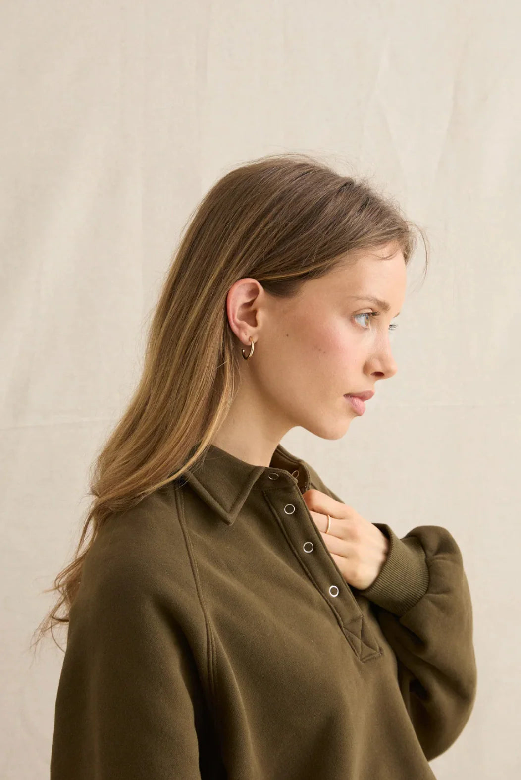 A new relaxed fit pullover with a collar and center front metal snap closure. Designed for cozy layering as the weather cools. Perfect for chilly mornings or post-surf lounging.