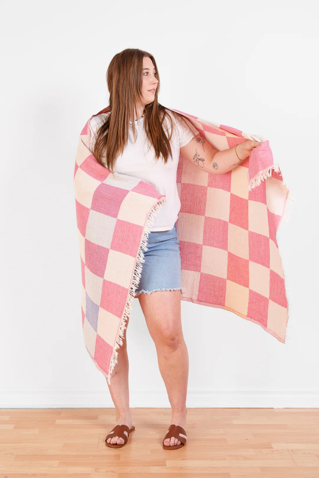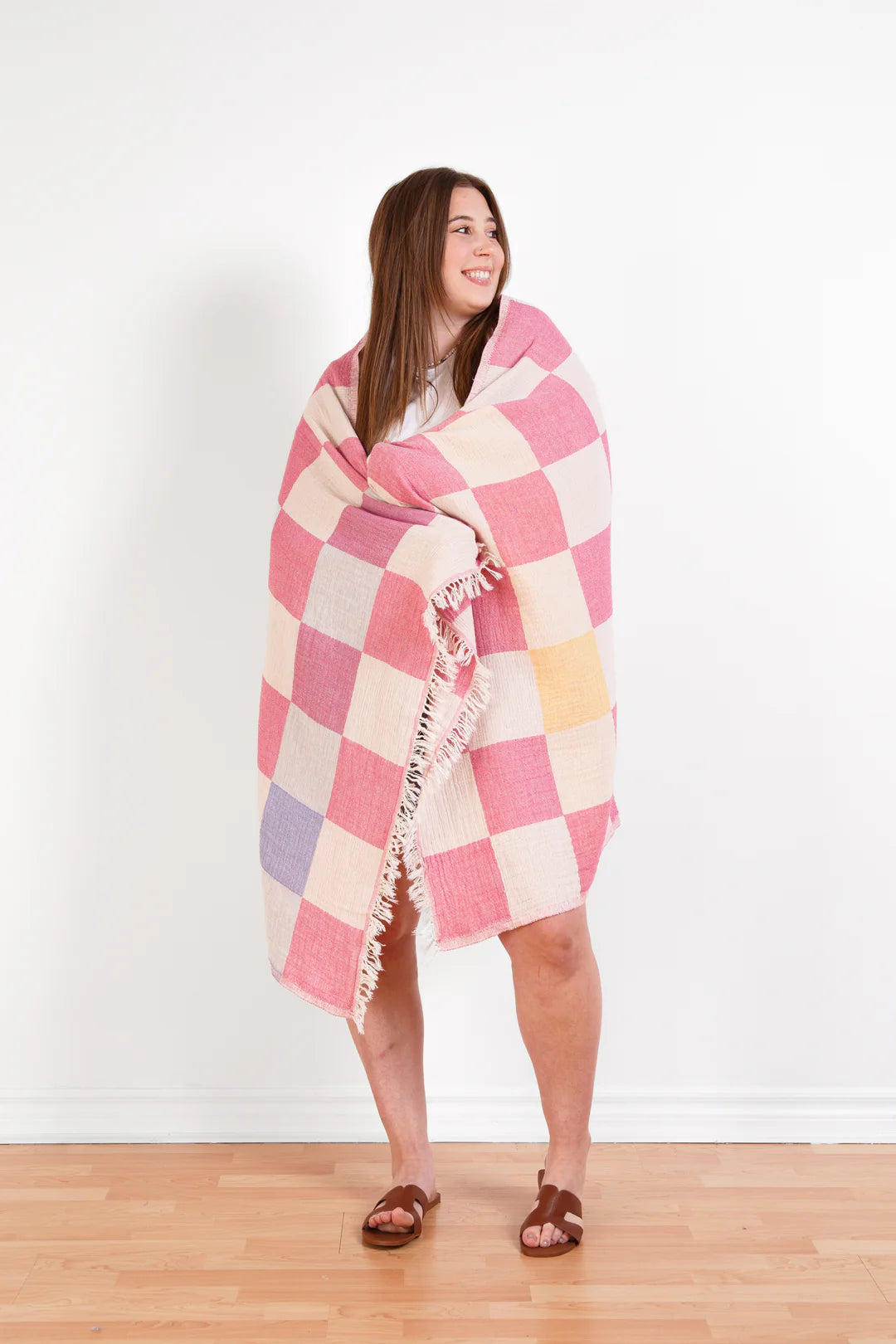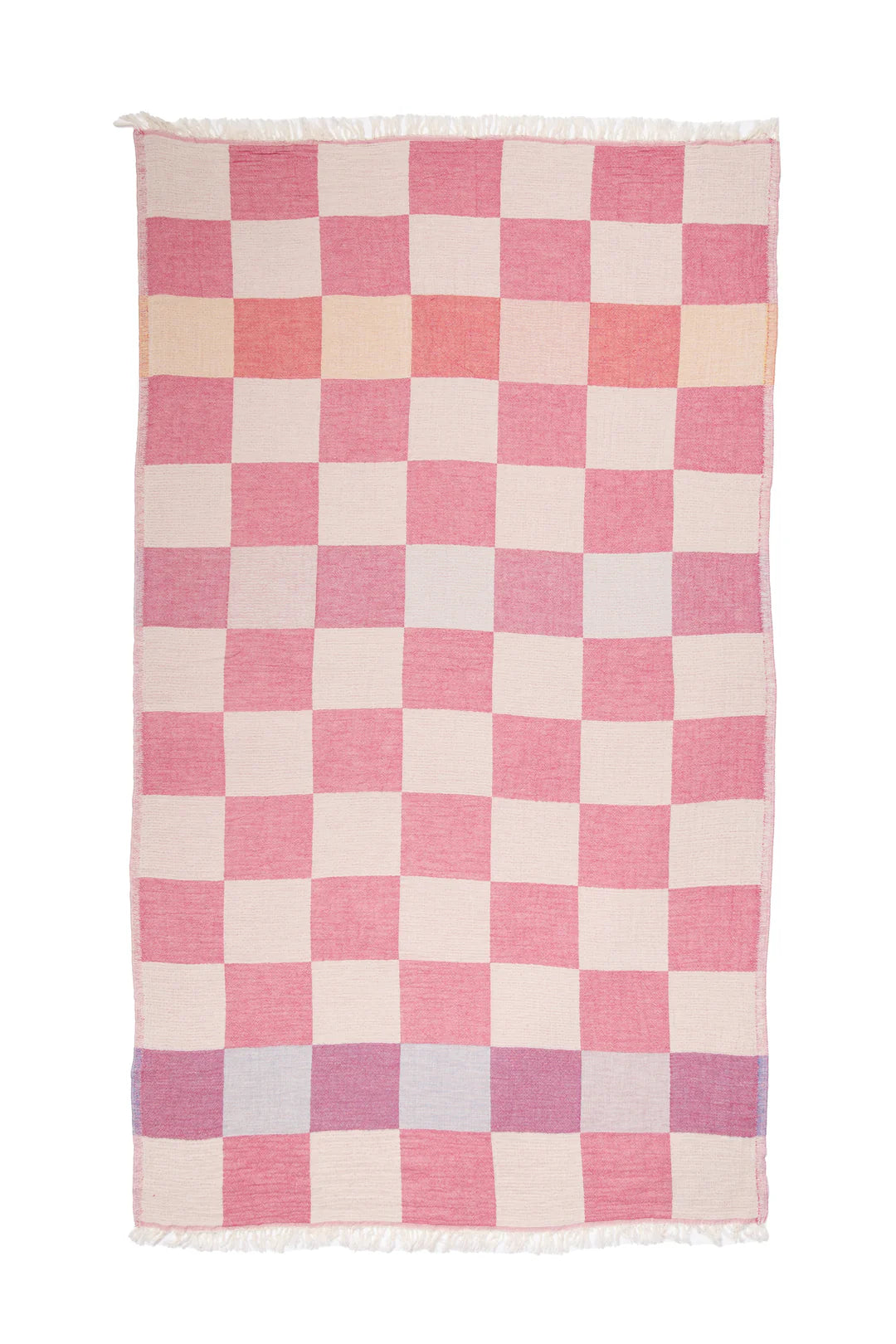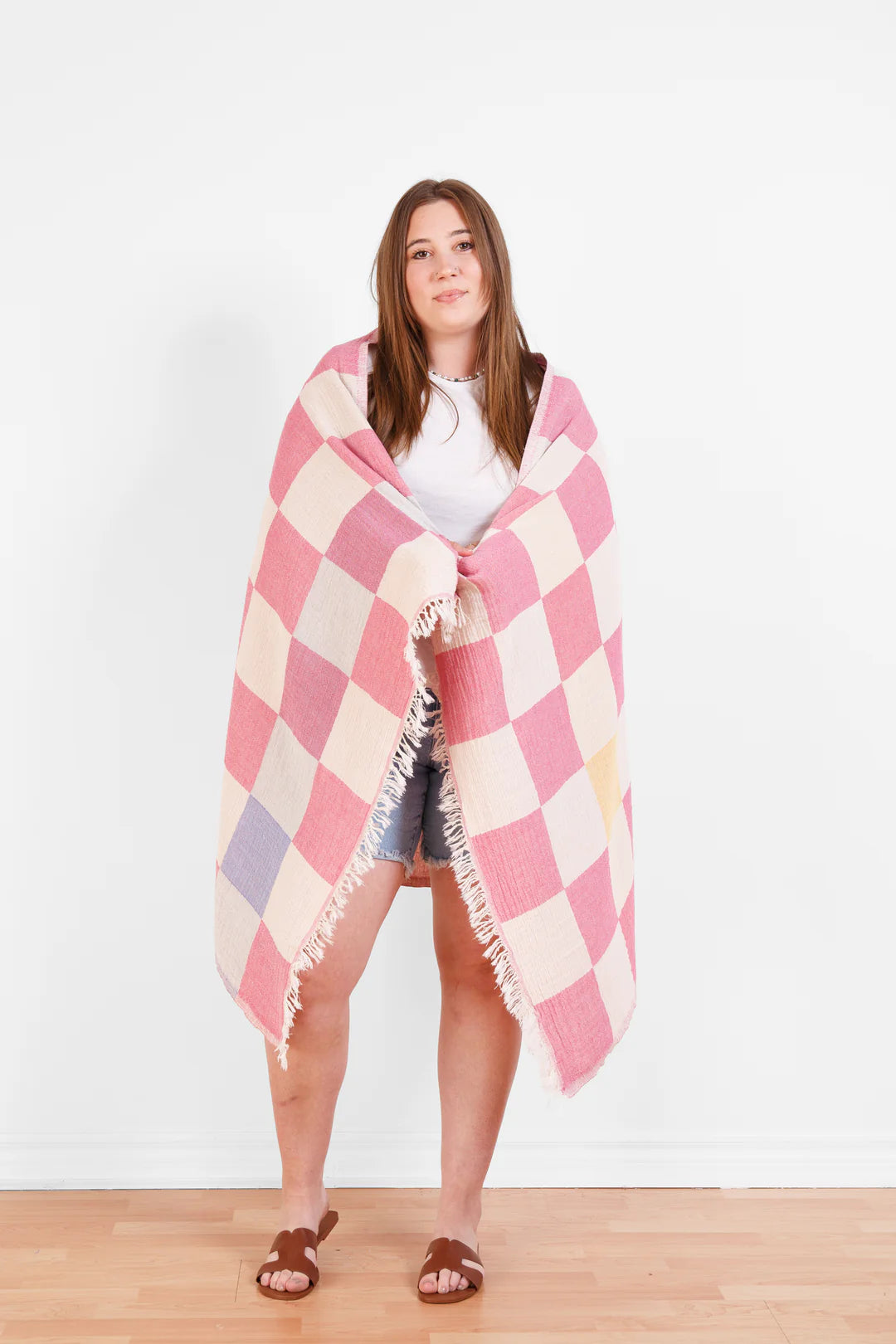 Instantly refresh your summer gear with one of our favourite new designs. This playful checkered towel is sure to bring a little extra joy to your trip to the beach, park or wherever you find yourself. Made from 100% Turkish muslin cotton, this towel isn't only cute, it's super soft, ultra-absorbent, quick drying and earth friendly! Win-win...win-win?!